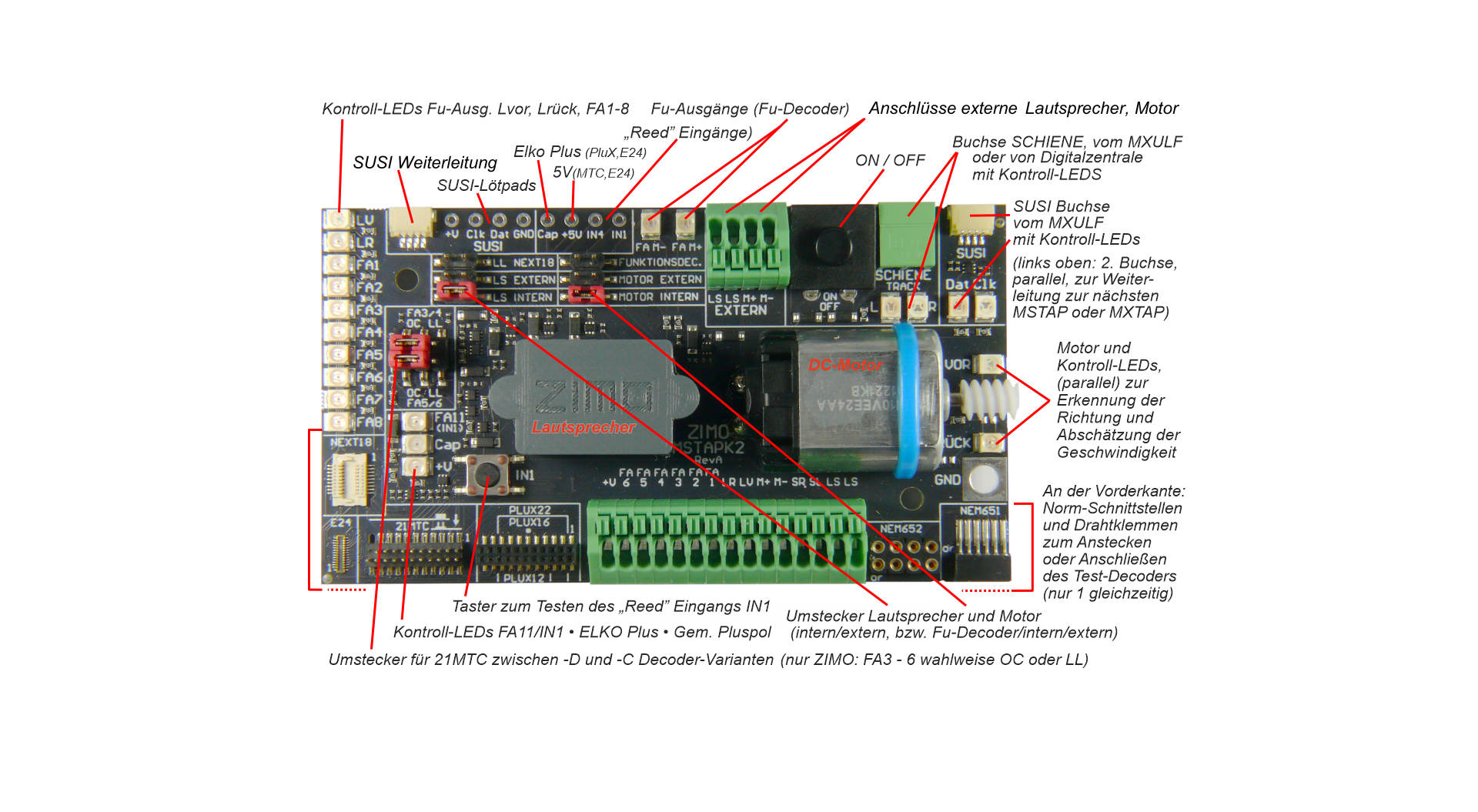 Die ZIMO Decoder-Test-und-Anschlussplatinen MSTAPK und MSTAPG werden meist zusammen mit dem Decoder-Update-und-Sound-Lade-Gerät MXULF verwendet, daneben auch mit ZIMO Basisgeräten (MX10 oder ältere ZIMO Digitalsystemen) oder mit Fremdsystemen. Sie dienen als Docking-Station für Decoder – ob mit Schnittstellen oder Drähten – um diese mit einer DCC Zentrale oder dem ZIMO MXULFA zu verbinden. Dadurch können Decoder auf ihre Funktionen getestet oder deren Software upgedatet, sowie ein Soundprojekt geladen werden. Um Tests durchzuführen sind alle Komponenten eines Modellfahrzeugs (s.u.) vorhanden.