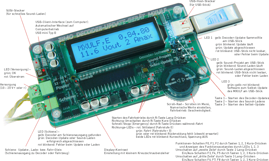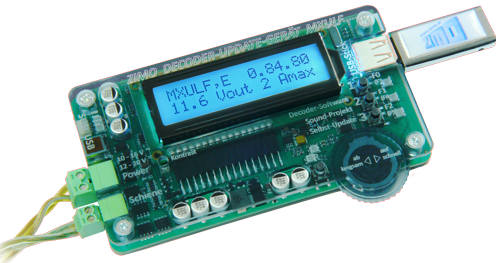 Das ZIMO MXULF (MX Update Laden Fahren) ist mehr als nur ein einfaches Decoder-Update-Gerät. Wie ein kleines Digitalsystem kann es folgende Aufgaben erfüllen: